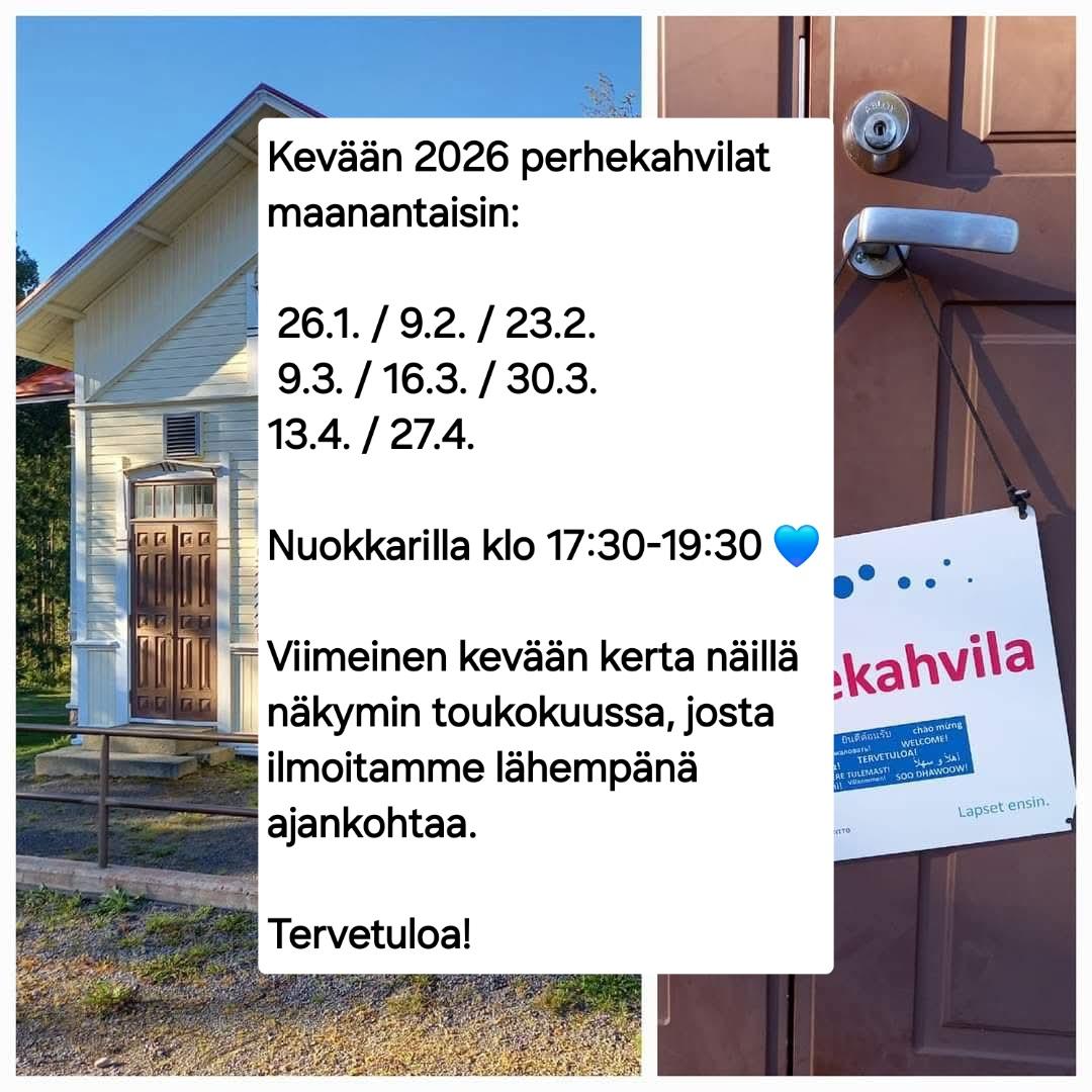 Iltaperhekahvilan kevään 2026 päivämäärät ovat selvillä ja ovet ovat avoinna maanantaisin klo 17:30-19:30 seuraavina ajankohtina: